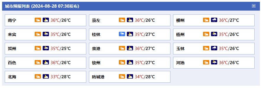 南寧市:今天白天到晚上,多云間晴、局地有陣雨或雷雨,偏南風1~2級,最高氣溫37℃,最低氣溫26℃。