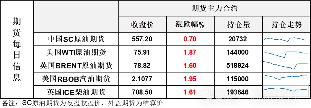 【1】WTI主力原油期貨收漲1.39美元,漲幅1.87%,報(bào)75.91美元/桶;布倫特主力原油期貨收漲1.24美元,漲幅1.6%,報(bào)78.82美元/桶;INE原油期貨收漲0.7%,報(bào)557.2元。