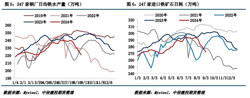 三、 鐵礦石需求:8月需求端持續(xù)轉(zhuǎn)弱,鐵水產(chǎn)量高位回落