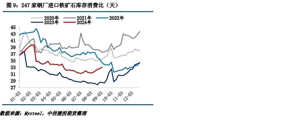 (2)鋼廠庫(kù)存:鋼廠進(jìn)口礦庫(kù)存繼續(xù)降低。據(jù)Mysteel統(tǒng)計(jì)數(shù)據(jù),截止8月30日,247家鋼廠進(jìn)口鐵礦石庫(kù)存總量為8996.47萬(wàn)噸,環(huán)比減少3.59萬(wàn)噸,高于去年同期;從相對(duì)量來(lái)看,當(dāng)前樣本鋼廠的進(jìn)口礦日耗為272.18萬(wàn)噸,環(huán)比減少3.90萬(wàn)噸,庫(kù)存消費(fèi)比33.05,環(huán)比增加0.45天。