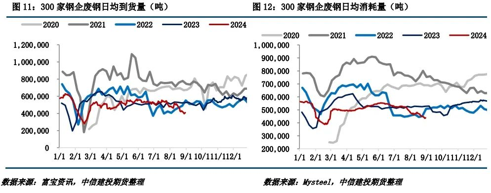 (2)廢鋼供需:多地鋼廠依舊停產(chǎn),廢鋼日耗窄幅下降。截止8月28日,Mysteel統(tǒng)計(jì)300家鋼廠廢鋼日消耗總量43.54萬(wàn)噸,較上周減少1.49萬(wàn)噸,降幅3.31%;月環(huán)比減少4.19萬(wàn)噸,降幅8.78%;年同比減少9.29萬(wàn)噸,降幅17.58%。一方面,即使高溫天氣逐漸出伏,但多地雨水天氣集中,仍然限制下游開(kāi)工進(jìn)度,建材成交尚未明顯好轉(zhuǎn),影響鋼廠生產(chǎn)積極性;另一方面,多地鋼廠依舊處于停產(chǎn)狀態(tài),雖部分地區(qū)電爐廠復(fù)產(chǎn),但僅維持谷電短時(shí)生產(chǎn),本周鋼廠廢鋼日耗窄幅下降。