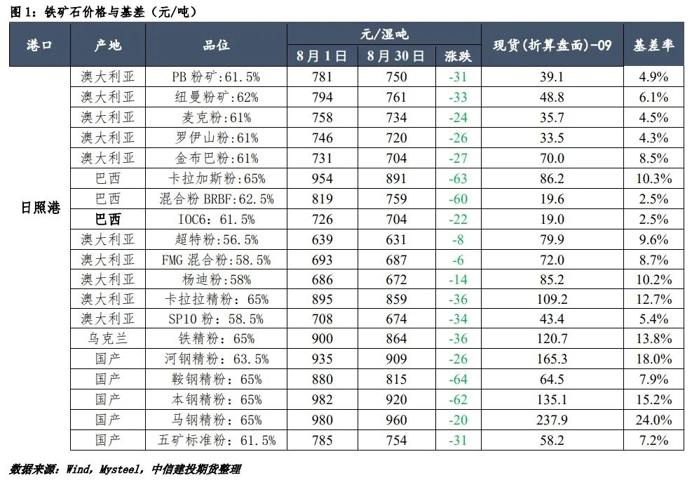展望9月份,天氣條件的好轉(zhuǎn)將利好下游訂單,成材帶動(dòng)原料上漲同時(shí)修復(fù)鋼廠利潤(rùn),9月中旬市場(chǎng)將逐步驗(yàn)證旺季預(yù)期,上漲動(dòng)能減弱,預(yù)計(jì)礦價(jià)回歸震蕩。9月鐵礦石均價(jià)或高于8月,但當(dāng)前期貨盤(pán)面反彈速度過(guò)快,提前交易了9月鋼廠復(fù)產(chǎn),短期礦價(jià)有調(diào)整需求。