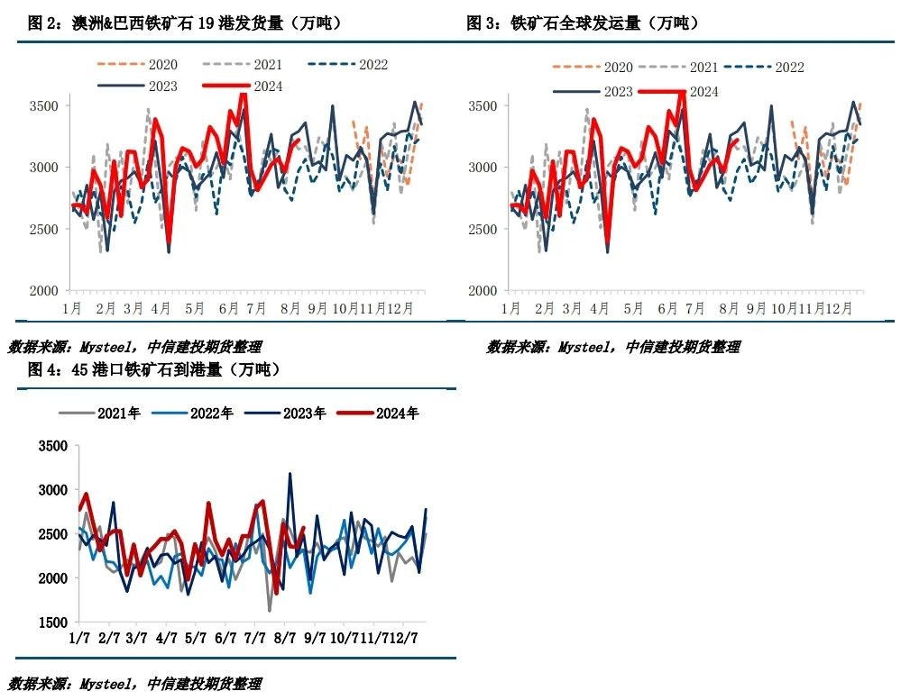 (2)鐵礦石到港量近端供給:8月份45港到港總量環(huán)比減少,仍處于近三年同期高位。預(yù)計(jì)絕對(duì)值為10903萬(wàn)噸,環(huán)比減少3萬(wàn)噸;8月日均到港351.7萬(wàn)噸,環(huán)比減少0.1萬(wàn)噸。根據(jù)Mysteel數(shù)據(jù),本期中國(guó)45港到港總量為2567萬(wàn)噸,周環(huán)比增加219.1萬(wàn)噸,較上月周均值高104萬(wàn)噸;8月到港量周均值為2470萬(wàn)噸,環(huán)比7月增加7.3萬(wàn)噸,同比去年8月增加27萬(wàn)噸。根據(jù)前期發(fā)運(yùn)量及季節(jié)性推算,預(yù)計(jì)9月供應(yīng)格局較8月寬松。
