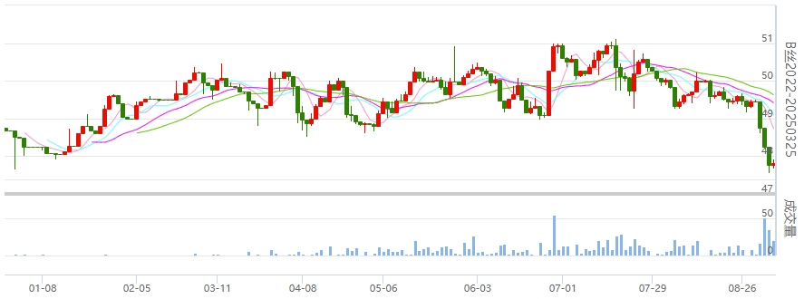 20/22D商檢4A級生絲:在三根大陰線后,今日(周三)生絲盤面有所止跌,活躍月份240925、250325和250925合約今日略下跌后有所反彈,倉量有所下降,今日均略收紅。