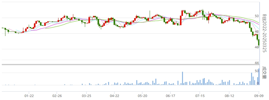 今日(2024年09月09日,周一)中國繭絲綢交易市場生絲電子指數(shù)下跌0.88%報(bào)收于4696.92點(diǎn)。B絲2022D(商檢4A級(jí)生絲):240925合約下跌0.66萬元報(bào)收于47.13萬元;250325合約下跌0.75萬元報(bào)收于46.50萬元;250925合約下跌0.66萬元報(bào)收于46.17萬元。