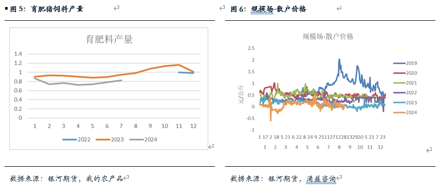 散戶減量仍然是豬源供應(yīng)減少最主要的部分,從三方機(jī)構(gòu)公布的飼料數(shù)據(jù)來看,鋼聯(lián)口徑育肥料環(huán)比增加約5.33%,由此折算同比降幅大約在13.09%,根據(jù)涌益口徑折算,同比降幅大約在15%左右。由于在統(tǒng)計供應(yīng)端的出欄量表現(xiàn),因此主要參照的是育肥數(shù)據(jù),從兩家公布的數(shù)據(jù)來看,整體還是保持著比較高的共同趨勢。可以看到,在過去的幾個月中,育肥料的環(huán)比一直呈現(xiàn)增加狀態(tài),說明在此前一段時間中,散戶補欄積極性有所提高,這也從側(cè)面反映了仔豬銷量的一大流向。其實總體來看,仔豬料環(huán)比增長從今年前期就開始有一定表現(xiàn),母豬料雖然也有所增加,但是增速整體偏慢,且相對比較平穩(wěn)。從出欄端考慮,育肥料銷量同比下降反映了前期育肥豬存欄數(shù)量的減少,同時出欄數(shù)量也有所減少,不過由于月內(nèi)生豬出欄體重整體較去年有明顯增加,預(yù)計散戶適重生豬在月內(nèi)降幅可能更加明顯,根據(jù)飼料線性推算來看,減幅大約在17%-18%左右。不過需要考慮的是,月內(nèi)散戶出欄積極性整體有所增加,從規(guī)模廠與散戶出欄比價來看,本月二者價差有所反彈,一定程度反映了散戶出欄積極性有所提高的情況。