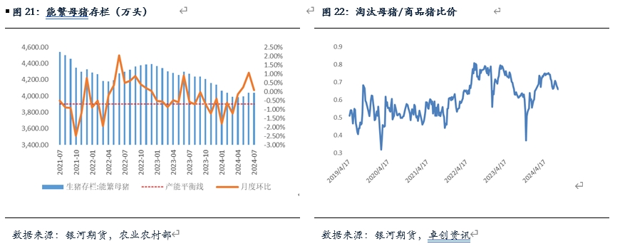 整體來看,7月份市場公布的能繁存欄數(shù)據(jù)基本符合預(yù)期,農(nóng)業(yè)農(nóng)村部口徑7月能繁存欄環(huán)比增加0.07%,增速較6月及此前幾個月份明顯放緩,可以看到,隨著豬價加速上漲,市場對后續(xù)預(yù)期開始有一定的走弱表現(xiàn),淘汰母豬與商品豬比價在月內(nèi)也有所走弱,產(chǎn)能增速整體有所放緩。不過8月以來,母豬價格整體有一定的反彈表現(xiàn),雖然淘汰母豬與商品豬比價延續(xù)走弱,但預(yù)計整體能繁存欄仍然呈現(xiàn)抬升狀態(tài)。