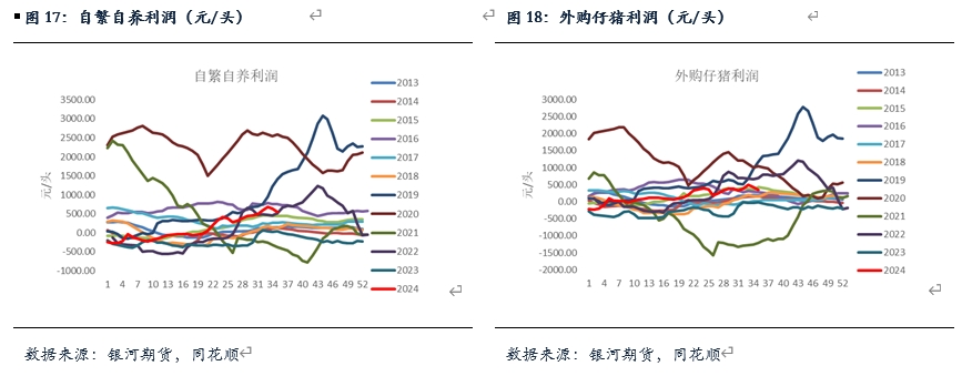 8月以來生豬養(yǎng)殖利潤整體跟隨現(xiàn)貨價格呈現(xiàn)沖高回落狀態(tài),此前養(yǎng)殖利潤的好轉(zhuǎn)主要受到豬價上漲較快的帶動,隨后價格逐步回落后,利潤開始逐步收窄。截止8月末,生豬自繁自養(yǎng)利潤542.76元/頭,上漲83.41元/頭;外購仔豬利潤342.02元/頭,下跌32.8元/頭。整體來看,自繁自養(yǎng)利潤稍優(yōu)于外購仔豬利潤,這主要由于年后仔豬價格快速上漲所致。