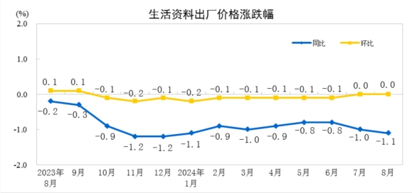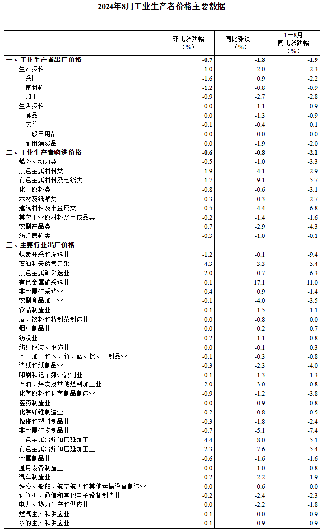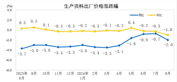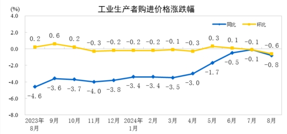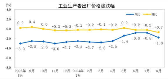 2024年8月份,全國工業(yè)生產(chǎn)者出廠價格同比下降1.8%,環(huán)比下降0.7%;工業(yè)生產(chǎn)者購進價格同比下降0.8%,環(huán)比下降0.6%。1—8月平均,工業(yè)生產(chǎn)者出廠價格比上年同期下降1.9%,工業(yè)生產(chǎn)者購進價格下降2.1%。
