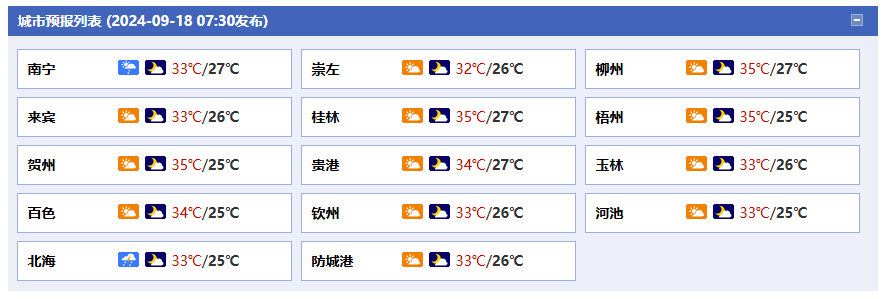 南寧市:今天白天多云有陣雨或雷雨,今天晚上多云,東北風(fēng)1~2級(jí),最高氣溫34℃,最低氣溫27℃。