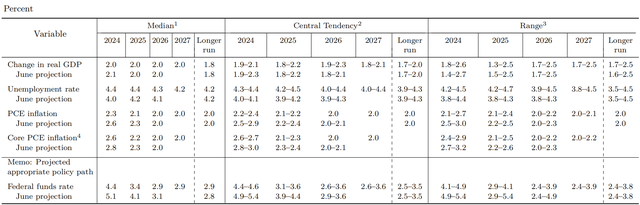 預(yù)測(cè)今年的失業(yè)率為4.4%,較6月上升0.4個(gè)百分點(diǎn);預(yù)測(cè)今年P(guān)CE(個(gè)人消費(fèi)支出)通脹為2.3%(6月預(yù)測(cè)值2.6%),2025年將回落至2.1%(6月預(yù)測(cè)值2.3%);預(yù)測(cè)今年核心PCE通脹為2.6%(6月預(yù)測(cè)值2.8%),2025年將回落至2.2%(3月預(yù)測(cè)值2.3%)。