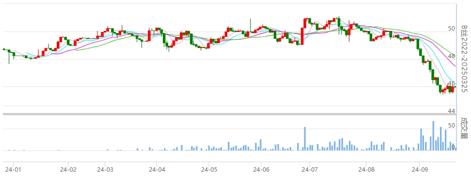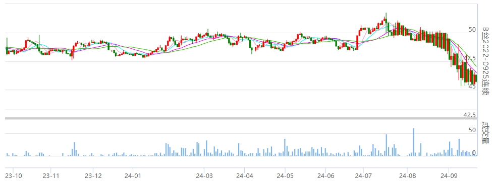 今日(2024年09月23日,周一)中國(guó)繭絲綢交易市場(chǎng)生絲電子指數(shù)下跌0.16%報(bào)收于4571.29點(diǎn)。B絲2022D(商檢4A級(jí)生絲):240925合約下跌0.42萬元報(bào)收于45.90萬元;250325合約下跌0.03萬元報(bào)收于45.99萬元;250925合約上漲0.12萬元報(bào)收于45.75萬元。