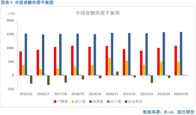 國內(nèi)供需格局:中性。8月我國白糖(6128, -19.00, -0.31%)及替代品進口量同環(huán)比增加,2023/24榨季結(jié)轉(zhuǎn)庫存量較大,導(dǎo)致目前我國食糖供應(yīng)充足;由于超強臺風(fēng)“摩羯”的影響,2024/25榨季我國食糖增產(chǎn)幅度將不及預(yù)期。后期盤面將逐步轉(zhuǎn)向新甘蔗糖定價,但不宜過分樂觀。