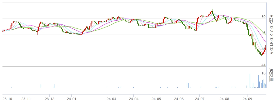 今日(2024年09月26日,周四)中國繭絲綢交易市場(chǎng)生絲電子指數(shù)上漲0.50%報(bào)收于4616.18點(diǎn)。B絲2022D(商檢4A級(jí)生絲):241025合約上漲0.27萬元報(bào)收于46.35萬元;250325合約上漲0.60萬元報(bào)收于47.10萬元;250925合約上漲0.21萬元報(bào)收于46.08萬元。