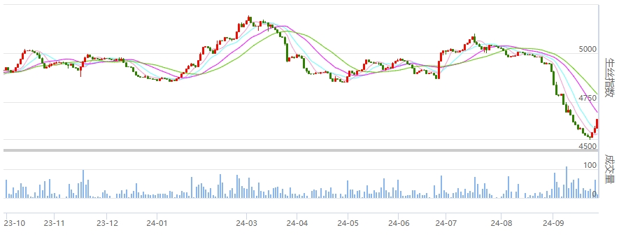 今日央行宣布今起降準(zhǔn)0.5個百分點。在政策面繼續(xù)加碼下,股票市場繼續(xù)漲勢如虹,市場情緒燃爆,上交所市場委托量太大,以至于交易系統(tǒng)出現(xiàn)異常;大宗商品大面積飄紅。宏觀層面利好下,今日生絲繼續(xù)飄紅。