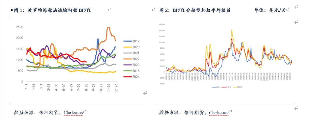 2024年8月海運貿(mào)易量相對平穩(wěn),中東、美灣維持低出口,俄羅斯原油出口從低位水平有所回升。根據(jù)Clarksons統(tǒng)計的全球海運貿(mào)易量指數(shù),歷史上每年7-9月均為油運旺季,而今年貿(mào)易量相對偏弱。