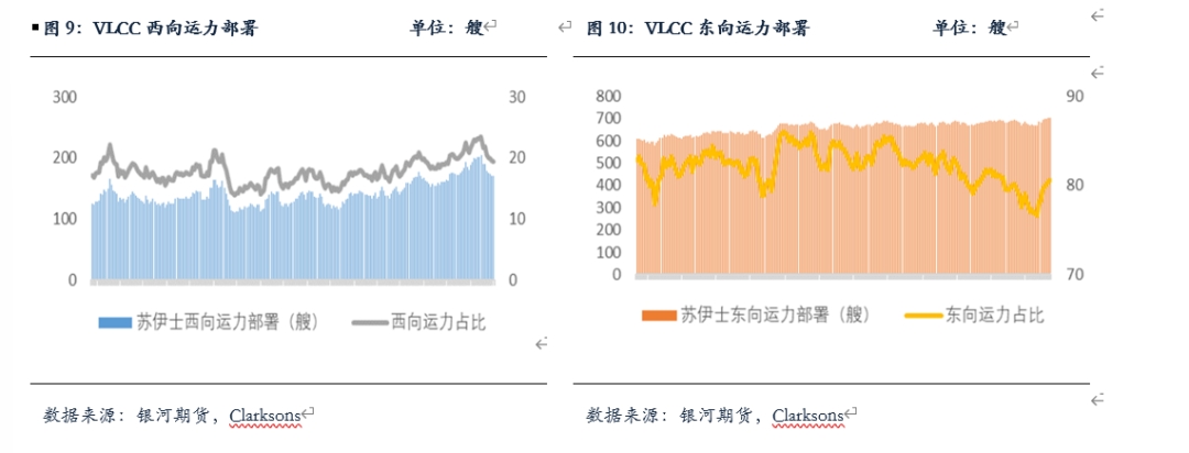 從運力結(jié)構(gòu)來看,VLCC東西運力一直處于分布不均的狀態(tài),東向運力一直遠超西向運力。2024年9月西向運力部署均值達到173艘,東向運力部署均值達到713艘,該現(xiàn)象較4、5月正在緩慢加劇,二季度開始西部運力占比維持下跌走勢。