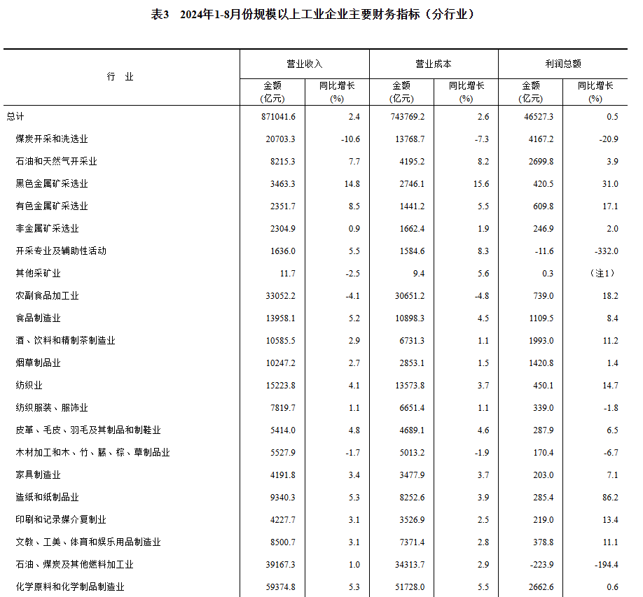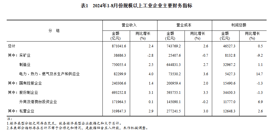 1—8月份,全國規(guī)模以上工業(yè)企業(yè)實現(xiàn)利潤總額46527.3億元,同比增長0.5%(按可比口徑計算,詳見附注二)。