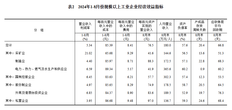 1—8月份,規(guī)模以上工業(yè)企業(yè)實現(xiàn)營業(yè)收入87.10萬億元,同比增長2.4%;發(fā)生營業(yè)成本74.38萬億元,增長2.6%;營業(yè)收入利潤率為5.34%,同比下降0.10個百分點。