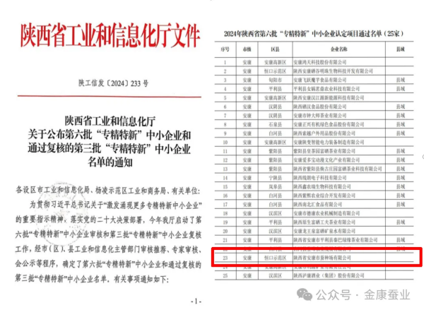 近日,陜西省工信廳印發(fā)《關(guān)于公布第六批“專精特新”中小企業(yè)和通過復(fù)核的第三批“專精特新”中小企業(yè)名單的通知》,經(jīng)審核推薦、專家評審和社會公示等程序,安康市蠶種場有限公司被認(rèn)定為2024年陜西省第六批“專精特新”中小企業(yè)。