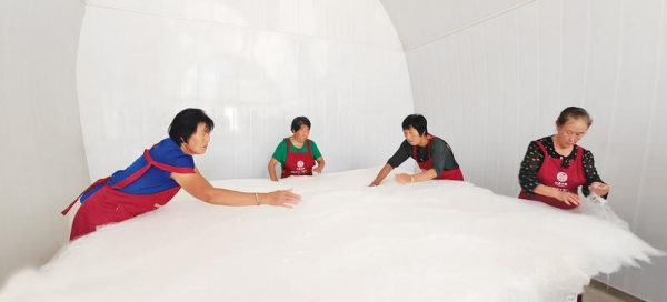 8月30,在延川縣關(guān)莊鎮(zhèn)楊家坪村蠶桑養(yǎng)殖示范基地,4名婦女正在為一戶蠶農(nóng)加工蠶絲被,他們拉開一塊塊銀光閃閃的蠶絲均勻地疊壓在一起,不一會兒,一塊輕盈柔滑的蠶絲被呈現(xiàn)在眼前。