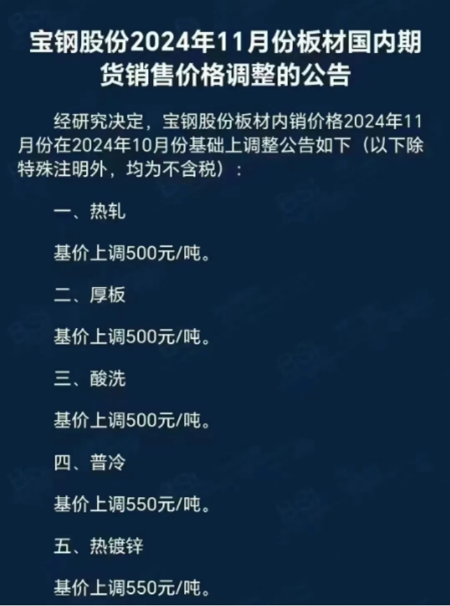 近日,寶鋼、鞍鋼、本鋼等國內一批大型鋼鐵企業(yè)公布了2024年11月份產(chǎn)品價格政策調整信息,均在10月份的基礎上大幅上調了出廠價,每噸最高上調600元。