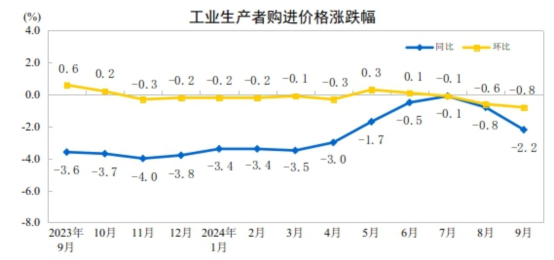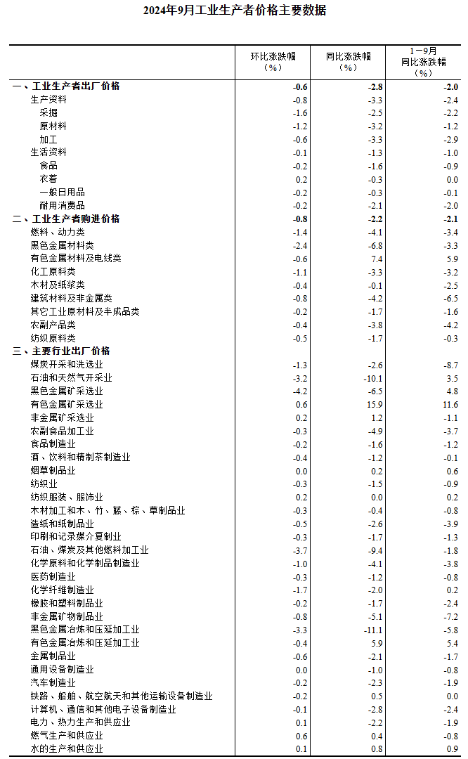 2024年9月份,全國工業(yè)生產者出廠價格同比下降2.8%,環(huán)比下降0.6%;工業(yè)生產者購進價格同比下降2.2%,環(huán)比下降0.8%。1—9月平均,工業(yè)生產者出廠價格比上年同期下降2.0%,工業(yè)生產者購進價格下降2.1%。