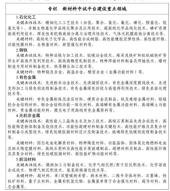 《指南》圍繞加快推進(jìn)新型工業(yè)化、建設(shè)制造強(qiáng)國戰(zhàn)略需求,著眼事關(guān)國家安全和經(jīng)濟(jì)建設(shè)的關(guān)鍵短板材料、引領(lǐng)新興產(chǎn)業(yè)和未來產(chǎn)業(yè)發(fā)展的前沿材料,聚焦“觸類旁通”效應(yīng)明顯、行業(yè)進(jìn)步帶動(dòng)性強(qiáng)的關(guān)鍵共性技術(shù),確定新材料中試平臺(tái)建設(shè)的重點(diǎn)領(lǐng)域,包括石化化工、鋼鐵、有色金屬、無機(jī)非金屬、前沿材料。其中,在石化化工領(lǐng)域,涉及高性能纖維、功能性膜材料、生物基材料、新型催化材料等關(guān)鍵材料;在無機(jī)非金屬領(lǐng)域,涉及高性能纖維及其復(fù)合材料制備與成型技術(shù)等關(guān)鍵共性技術(shù),高性能纖維及其復(fù)合材料等關(guān)鍵材料。