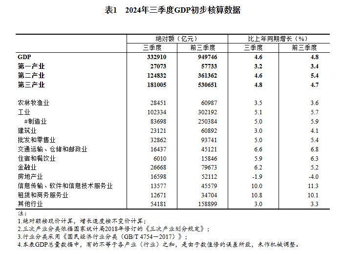 根據(jù)有關(guān)基礎(chǔ)資料和國內(nèi)生產(chǎn)總值(GDP)核算方法,經(jīng)初步核算,我國2024年三季度GDP核算結(jié)果如下。