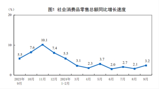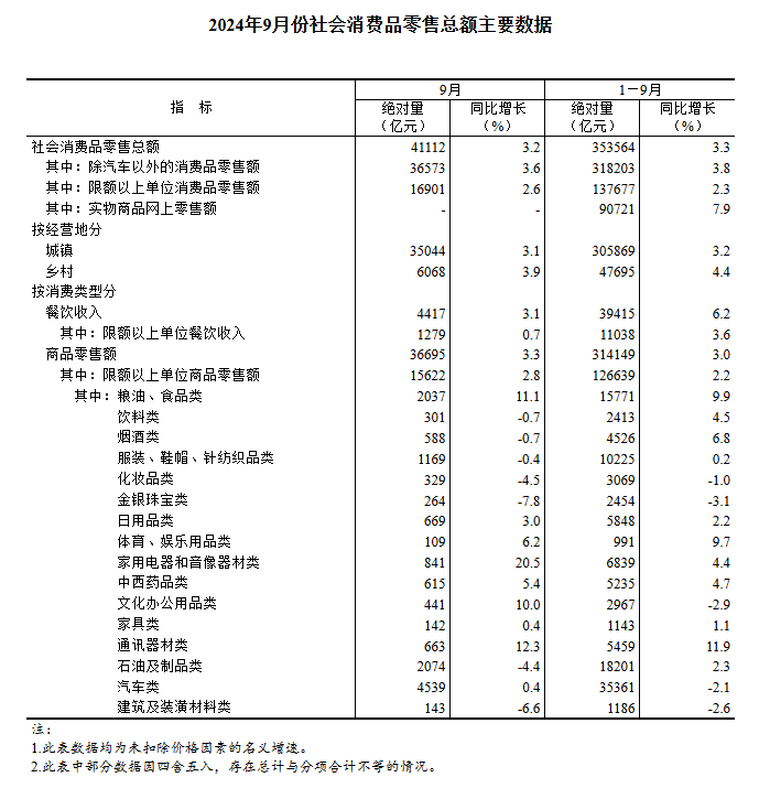 9月份,社會消費品零售總額41112億元,同比增長3.2%,增速比上月加快1.1個百分點。其中,除汽車以外的消費品零售額36573億元,增長3.6%。1—9月份,社會消費品零售總額353564億元,同比增長3.3%。其中,除汽車以外的消費品零售額318203億元,增長3.8%。