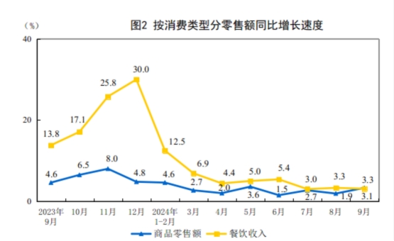 按消費類型分,9月份,商品零售額36695億元,同比增長3.3%;餐飲收入4417億元,增長3.1%。1—9月份,商品零售額314149億元,增長3.0%;餐飲收入39415億元,增長6.2%。