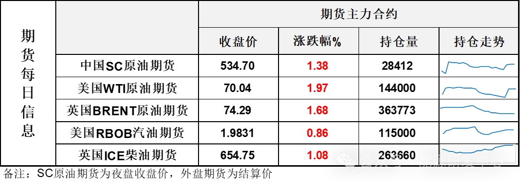 【1】WTI主力原油期貨收漲1.35美元,漲幅1.97%,報70.04美元/桶;布倫特主力原油期貨收漲1.23美元,漲幅1.68%,報74.29美元/桶;INE原油期貨收漲1.38%,報534.7元。