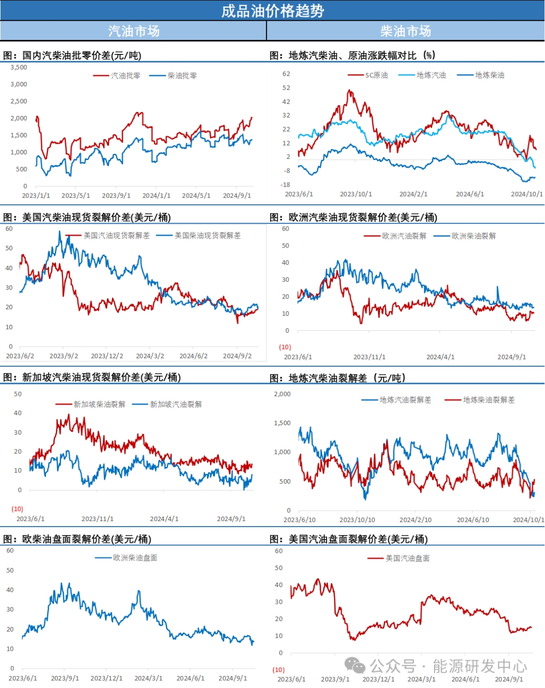 周一歐洲時段之后油價反彈力度有所加大,基本收復(fù)了上周五跌幅,讓油價延續(xù)了區(qū)間震蕩格局。中東地緣局勢上周有所降溫但仍會持續(xù)困擾市場,目前來看中東地緣逐步趨于以色列的回應(yīng)力度有限的方向發(fā)展。供需層面目前油市也是多空交織格局,從高頻指標來看雖然油價波動幅度較大,但成品油裂解差及月差走勢均較為溫和,國內(nèi)SC與歐美油價的跨區(qū)價差也在過去一周多時間開始回落。從高頻指標的整體表現(xiàn)來看目前原油(607, -8.60, -1.40%)市場沒有非常強的方向性驅(qū)動。油價失控大漲風(fēng)險基本消除,但同樣在現(xiàn)階段諸多不層面確定性增加了參與者觀望情緒,油價破位下行概率也較小,簡答可概括為單邊驅(qū)動能量不足,油價被困在震蕩格局中,但仍處在高波動階段,這也讓市場參與者在進行押注時非常謹慎。