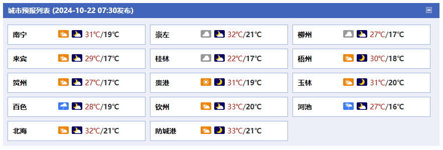 23日白天到晚上,全區(qū)多云到晴。桂東及沿海地區(qū)有5級(jí)、陣風(fēng)7~8級(jí)偏北風(fēng)。各地氣溫:桂北8~28℃,桂南16~29℃。24日白天到晚上,全區(qū)多云到晴。各地氣溫:桂北8~30℃,桂南16~32℃。