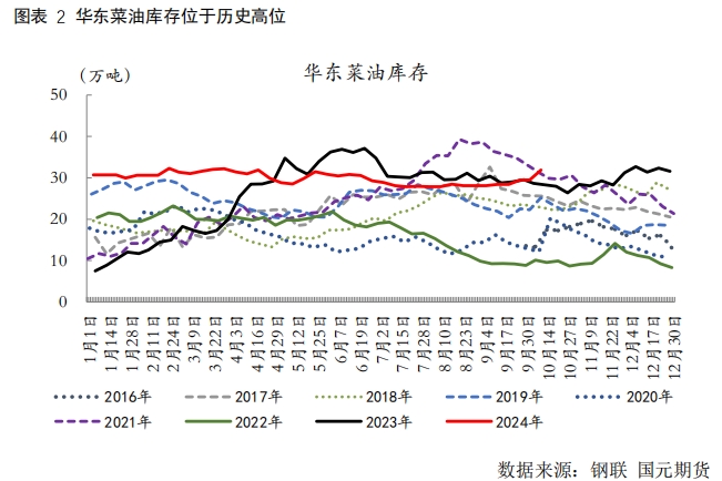 今年中國(guó)油菜籽進(jìn)口量仍大幅攀升。海關(guān)數(shù)據(jù)顯示,中國(guó)2024年9月油菜籽進(jìn)口量為80.6869萬(wàn)噸,環(huán)比增加35.69%,同比上升151.17%,刷新歷史最高水平,高于去年12月創(chuàng)下的73.888萬(wàn)噸。加拿大依然第一大供應(yīng)國(guó),9月從加拿大進(jìn)口油菜籽78.3499萬(wàn)噸,環(huán)比上升35.83%,同比增加161.76%。據(jù)Mysteel調(diào)研顯示,2024年10月國(guó)內(nèi)進(jìn)口菜籽量仍維持偏高水平,具體來(lái)看,沿海地區(qū)進(jìn)口菜籽預(yù)估到港船數(shù)6條,菜籽數(shù)量約39萬(wàn)噸。四季度隨著氣溫降低,油脂消費(fèi)開(kāi)始進(jìn)入季節(jié)性高峰期,菜油整體維持供需兩強(qiáng)格局。