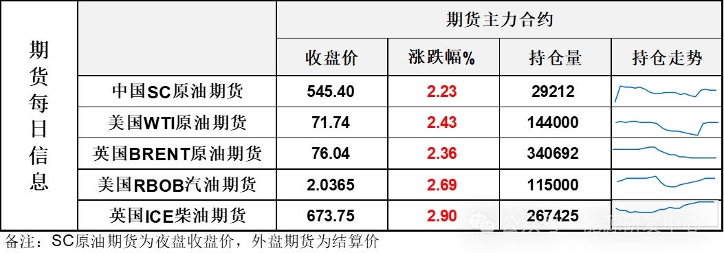 【1】WTI主力原油期貨收漲1.7美元,漲幅2.43%,報71.74美元/桶;布倫特主力原油期貨收漲1.75美元,漲幅2.36%,報76.04美元/桶;INE原油期貨收漲2.23%,報545.4元。