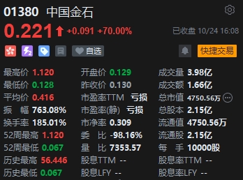 中國金石盤中一度漲超700%,最終收漲70%。消息面上,中國金石此前發(fā)布截至2024年6月30日止六個月業(yè)績,收入3077.2萬元(人民幣,下同),同比增長104.6%;凈虧損1659.2萬元,同比擴(kuò)大84.6%。值得注意的是,大股東鄭永暉于8月30日增持且好倉比例由20.10%升至24.02%。而中國金石于10月21日公布,鄭永暉先生已辭任公司執(zhí)行董事,自2024年10月21日起生效。