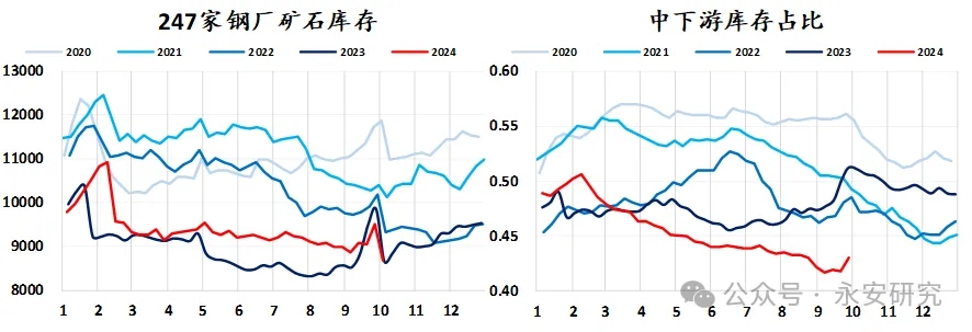 在我們上一篇報告《臨近旺季,深度負反饋可能性降低》中談到,淡季期間鋼廠持續(xù)低產(chǎn)使得鋼材下游庫存去化健康,考慮到本輪鋼廠減產(chǎn)對于鋼材的供需平衡表形成了有效修復(fù),且上中下游庫存都偏低,旺季期間高爐若繼續(xù)維持低產(chǎn)或?qū)⑹沟娩摬某霈F(xiàn)新的供需錯配,而近期在宏觀政策推動下,黑色大幅度反彈,其中前期中下游庫存補充并不充裕的相關(guān)品種反彈幅度較為明顯,截至10月22日,日照港PB粉753元/濕噸,期貨2501合約收于762元/噸。隨著鋼材價格反彈,鋼廠利潤逐步修復(fù),高爐復(fù)產(chǎn)意愿明確抬升,鐵礦(805, -22.00, -2.66%)石的反彈一定程度上反應(yīng)了復(fù)產(chǎn)預(yù)期。