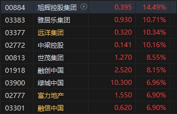 內(nèi)房股普遍走強(qiáng),旭輝控股漲超14%。消息面上,在政策支持力度持續(xù)加大的背景下,10月商品房銷售端持續(xù)回暖,提振市場(chǎng)信心。其中一線樓市成交明顯走強(qiáng),更是成為內(nèi)房股短線行情的催化劑。此外,10月28日,旭輝控股集團(tuán)(0.395, 0.05, 14.49%)發(fā)布境外債務(wù)重組的重大進(jìn)展公告。截至10月27日,合計(jì)持有適用債務(wù)約77.88%的債權(quán)人已正式簽訂或加入重組支持協(xié)議(RSA)。
