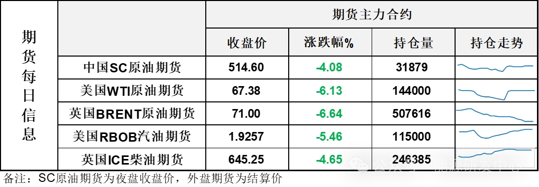 【1】WTI主力原油期貨收跌4.4美元,跌幅6.13%,報67.38美元/桶;布倫特主力原油期貨收跌5.05美元,跌幅6.64%,報71美元/桶;INE原油期貨收跌4.08%,報514.6元。