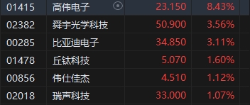 蘋果概念股漲幅居前,高偉電子漲超8%。消息面上,蘋果將于10月31日盤后公布其2024財年第四季度(即2024年第三自然季)業(yè)績。分析師最新預測,蘋果Q4營收為943.16億美元,同比增長5.38%;每股收益1.53美元,同比增長4.77%。