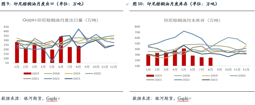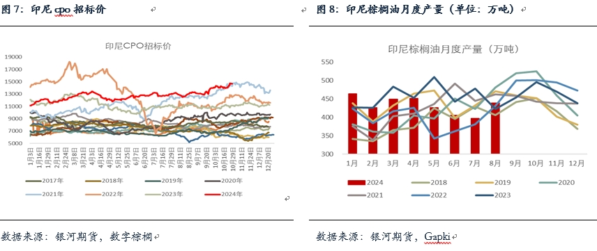 印尼方面,GAPKI數(shù)據(jù)顯示印棕8月產(chǎn)量恢復(fù)較為明顯,從7月的396萬噸增到438萬噸,出口有所增加但仍保持低位,從7月的224萬噸升至238萬噸,國內(nèi)消費量從7月的203萬噸增至206萬噸,由于國內(nèi)消費較為強勁,月末庫存繼續(xù)去庫至245萬噸的低位。目前印尼果串價格以及CPO招標(biāo)價仍維持上漲趨勢,基本接近甚至超過21年同期的高價。
