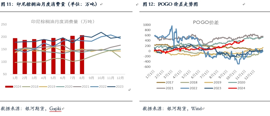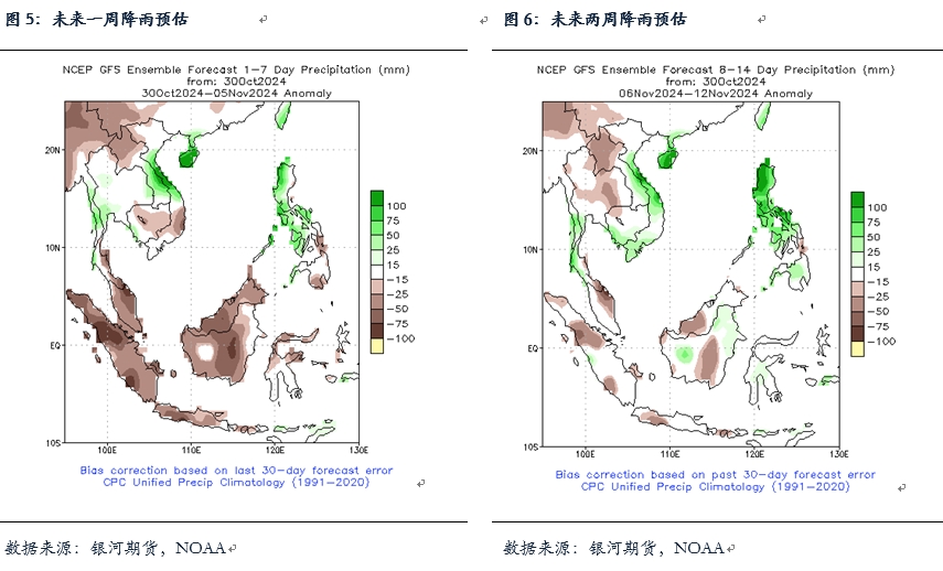 對于9月,ITS 數(shù)據(jù)顯示9月印棕出口為179萬噸,較8月的238萬噸減少24.8%,9月印棕出口表現(xiàn)欠佳。近期印尼頻繁提及明年實行B40甚至B50政策,若明年印尼實行B40政策,預(yù)計在生柴端帶來的棕櫚油消費增量將在150-220萬噸,但若實行B50,印尼的產(chǎn)量和庫存以及生柴基金等需要有較多的保障從而去推動B50的實施。目前POGO價差持續(xù)走高,截止10月30日已經(jīng)漲至410美元附近。另外,11月印棕CPO參考價將上調(diào)至962美元附近,出口稅將隨之上調(diào)一檔從74增至124美元。近期國際機構(gòu)對于四季度發(fā)生拉尼娜現(xiàn)象的預(yù)估逐漸減弱,預(yù)計今冬可能不會出現(xiàn)拉尼娜,即使出現(xiàn)也是弱拉尼娜,對產(chǎn)地的影響也將較為有限。整體上,8-10月為產(chǎn)地增產(chǎn)旺季,印尼棕櫚油產(chǎn)量或?qū)⒚黠@增加,不過由于印尼國內(nèi)消費較好等,印尼庫存即使出現(xiàn)累庫,供應(yīng)仍將維持在5年均線下。