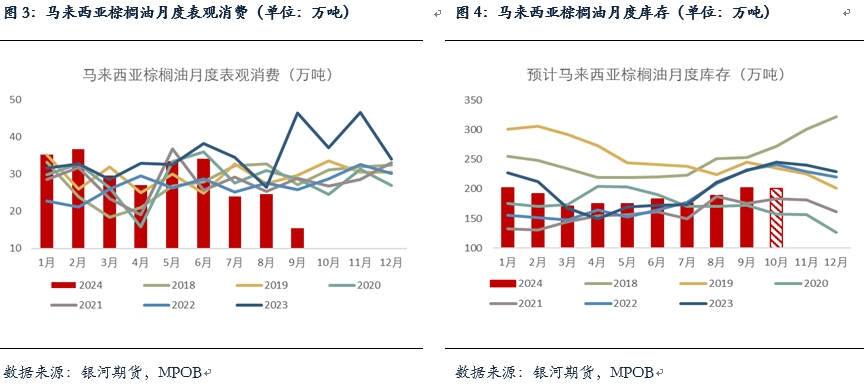 馬棕9月期末庫存累庫超預(yù)期至201萬噸,環(huán)比增加6.93%,其中產(chǎn)量減3.8%至182萬噸,減幅略超市場預(yù)期;出口小幅增加0.93%至154萬噸,超市場預(yù)期的-2%;消費減幅大超預(yù)期僅有15萬噸,處于歷史同期低位。9月馬棕出現(xiàn)旺季減產(chǎn),出口仍具韌性,但消費表現(xiàn)不佳,使得庫存累庫超預(yù)期,不過仍處于5年均線下,馬棕供應(yīng)仍不寬松。