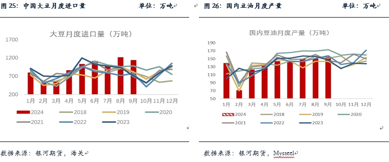 大豆(4521, -21.00, -0.46%)壓榨方面,9月大豆壓榨約在815萬噸,今年 1-9月豆油累計壓榨產(chǎn)量不及歷史同期,約在1208萬噸,低于5年和3年均值。大豆進口和買船方面,9月大豆進口在1137萬噸,高基數(shù)下環(huán)比減少6%,但處于歷史同期高位,10、11月大豆進口到港量預(yù)計分別為720萬噸和800萬噸左右,短期大豆供應(yīng)充足。庫存方面,截至2024年10月25日,全國重點地區(qū)豆油商業(yè)庫存113.4萬噸,環(huán)比上周增加0.40萬噸,增幅0.35%,處于歷史同期較為中性水平,預(yù)計后期豆油庫存將維持在這一水平附近或略低。豆油基差穩(wěn)中略增,華東基差報在01+180附近。目前大豆壓榨持續(xù)處于歷史同期偏高水平,豆油目前相較于菜油(8340, 2.00, 0.02%)和棕櫚油的性價比凸顯,現(xiàn)貨成交較好,提貨繼續(xù)轉(zhuǎn)好。整體上,目前國內(nèi)豆油性價比較好,庫存增速放緩,但豆油供應(yīng)較為充足,基本面仍偏弱。近期國際豆油價格上漲明顯,不過美豆美豆油盤面仍低位震蕩當(dāng)中,巴西迎來有利降雨,播種進度有所加快。預(yù)計短期豆油仍維持震蕩略偏強走勢。
