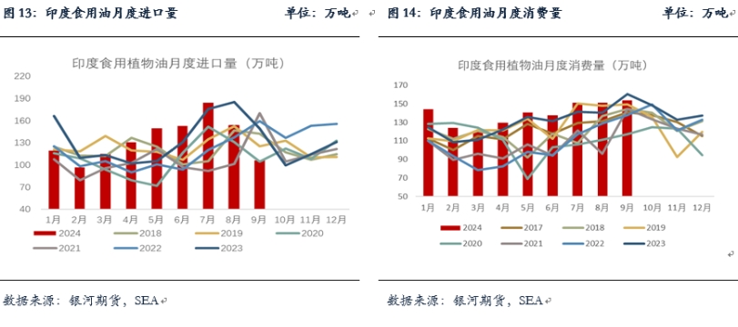 截至到9月,印度2023/24年度食用油進口量累計達到1454萬噸,同比下降6%。9月印度食用油進口量大幅降至106萬噸,處于歷史同期低位,環(huán)比減幅在30.7%。其中棕櫚油和葵油進口量下滑明顯,分別至53萬噸和15萬噸,而豆油(7630, 36.00, 0.47%)由于性價比以及存在一定進口利潤使得進口量雖有所下滑,但仍處歷史同期高位,至38萬噸。庫存方面,9月印度港口庫存降至82萬噸,其中棕油繼續(xù)去庫至32萬噸,豆油增至25萬噸,葵油降至25萬噸,目前葵油庫存仍處歷史同期偏高水平。