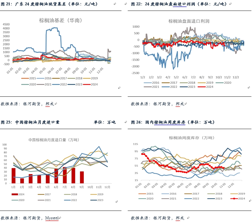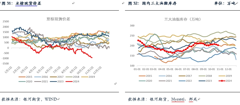 棕油進口方面,9月棕櫚油進口在30萬噸,環(huán)比減少約10萬噸(-24%),今年1-9月棕油累計進口僅有272萬噸,同比減少32%,也略低于22年的同期,持續(xù)處于偏低水平。買船方面,目前產(chǎn)地報價仍然較為堅挺,近遠月報價均在1000美元以上,棕櫚油近月進口利潤倒掛加深約在-600以上,10月以來國內(nèi)存在零星近月買船,但整體買船仍偏少,且存在外商回補的情況。預(yù)計10、11月棕油到港月均在25萬噸左右,其中11月比10月到港多。截至2024年10月25日(第43周),全國重點地區(qū)棕櫚油商業(yè)庫存49.01萬噸,環(huán)比上周減少2.58萬噸,減幅5.00%,高價之下棕櫚油現(xiàn)貨成交持續(xù)偏低,提貨一般,基差穩(wěn)中有降,華南基差報在01+150。豆棕現(xiàn)貨價差方面,豆棕現(xiàn)貨價差大幅走縮,目前已經(jīng)縮至1000附近的低位,短期這一局面或難出現(xiàn)快速轉(zhuǎn)變,需要豆油有新的驅(qū)動。目前國內(nèi)外棕櫚油維持供應(yīng)不寬松的狀態(tài),且棕油即將進入減產(chǎn)季,棕櫚油較強的基本面對盤面存在支撐,市場做多棕櫚油的情緒較為濃重,回調(diào)幅度比較有限。另外地緣及宏觀方面的反復(fù)也會對油脂盤面存在較大擾動,短期棕櫚油或仍維持高位震蕩的格局,但中期我們對棕櫚油仍維持震蕩偏強觀點。