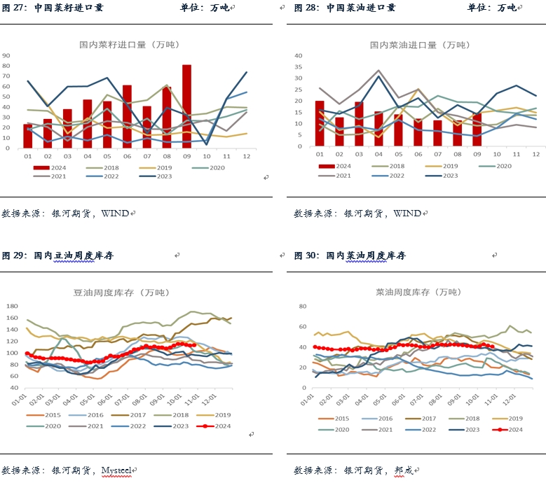 菜籽(5208, 89.00, 1.74%)壓榨方面,9月菜籽進口達到81萬噸的高位,環(huán)比增加36%。今年1-9月菜油累計壓榨產(chǎn)量達到160萬噸,處于歷史同期偏高,但仍低于去年同期。進口及買船方面,9月菜油進口14.6萬噸,略高于8月,1-9月累計進口131萬噸,亦低于去年同期。近期受中國對加菜籽進行反傾銷審查,國內(nèi)遠月菜籽洗船較多,但近月菜籽預(yù)計到港在40-50萬噸,菜油供應(yīng)仍然充足。截至2024年10月25日,菜油庫存40.55萬噸,環(huán)比前一周減少1萬噸,減幅2.4%,去庫速度較慢,處于歷史同期較為偏高水平。菜油基差維持低位震蕩,廣西三菜基差報至01-130。從基本面上看,國內(nèi)菜油供應(yīng)充足,需求一般,基本面較為偏弱,但由于反傾銷事件的存在使得不確定性增加,對于菜油盤面形成一定的支撐,菜油短期上有壓力下有支撐的格局延續(xù),維持高位寬幅震蕩。
