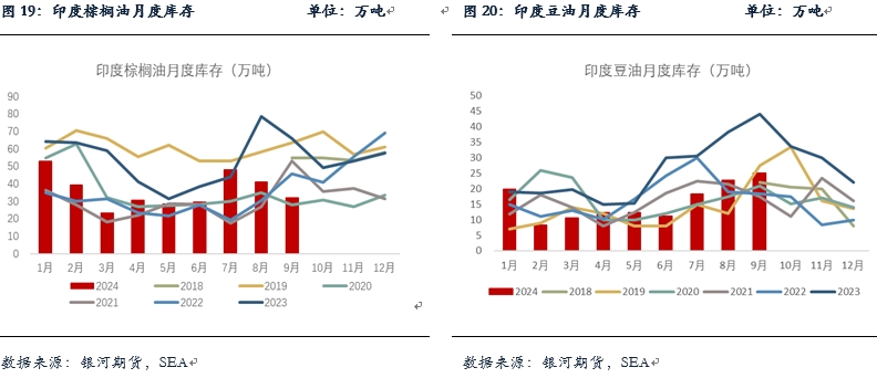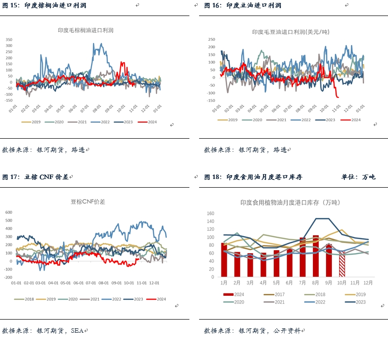 由于近期印度上調(diào)食用油進口稅,而食用油國際價格也在快速上漲,使得印度在棕櫚油以及豆油等食用油上的進口利潤快速惡化。此前印度精煉商取消了10萬噸10-12月交付的棕櫚油采購訂單,近期時常還存在洗船。10月底印度迎接排燈節(jié)假期,預(yù)計10月印度食用油進口量或?qū)⒊霈F(xiàn)下降,與此同時港口庫存將繼續(xù)去庫至歷史同期偏低水平。
