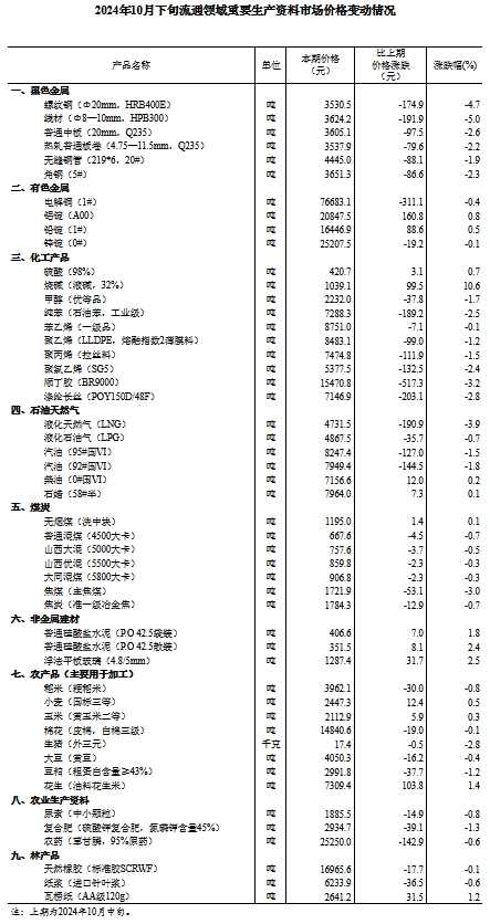 據(jù)國家統(tǒng)計(jì)局網(wǎng)站消息,國家統(tǒng)計(jì)局4日發(fā)布2024年10月下旬流通領(lǐng)域重要生產(chǎn)資料市場價格變動情況。